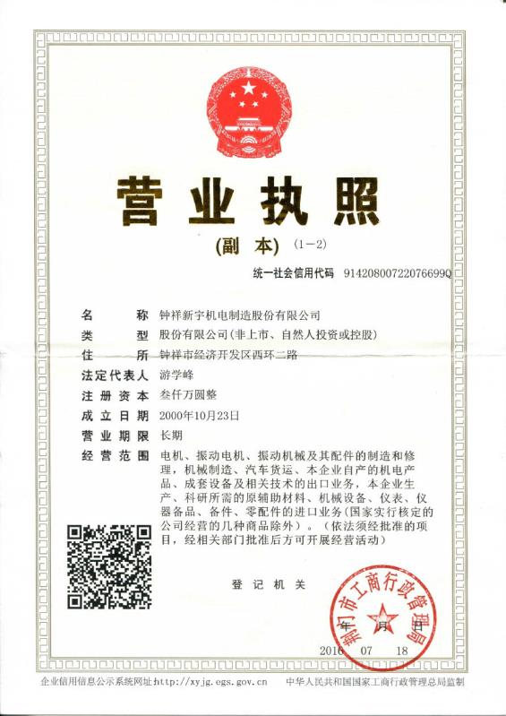 ? ? ? ?科研开发力量雄厚,公司技术中心认定为“湖北省企业技术中心”,现有教授级高级工程师2人,享受国家政府津贴专家2人,是国家部颁(行业)标准《振动源三相异步振动电机技术条件》的主要制订单位。企业内部局域网、公司网站、CAD设计系统、互联网已构筑起企业计算机信息管理系统;企业质量管理体系获得ISO9001:2000质量管理体系认证证书;产品获CQC认证和CCC认证;享有“外贸进出口自营权”。是国内很早生产振动电机的厂家之一,生产的“宇兴”牌振动电机是国内振动电机行业和广大客户公认的品牌产品,其可靠性、技术性能在国内属领先地位。