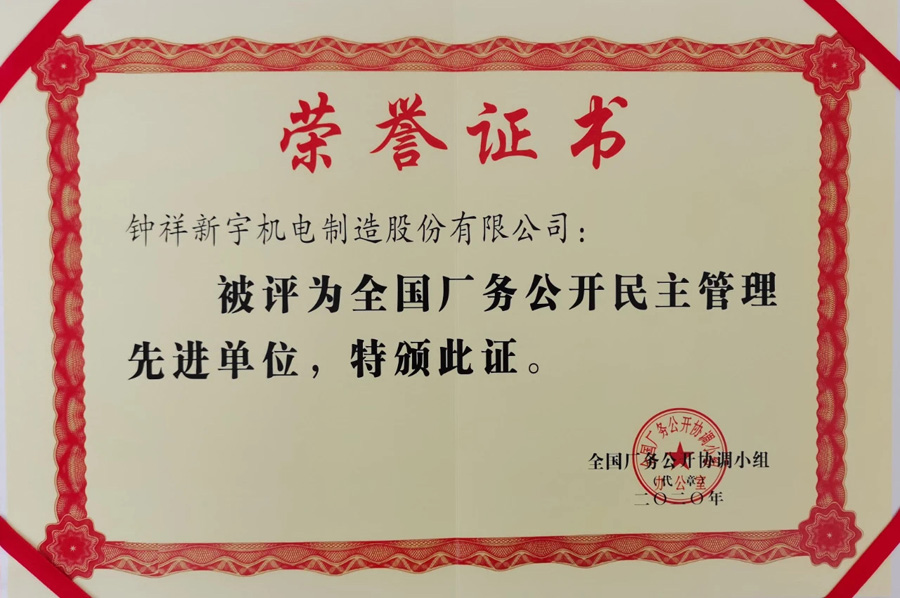 全国厂务公开民主管理先进单位每三年表彰一次,湖北省今年共计有15家企业荣获该荣誉称号,钟祥710公海赌赌船官网欢迎您机电制造股份有限公司作为 湖北省唯一的一家中小型民营制造企业榜上有名。