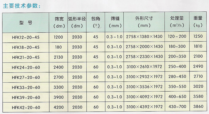 HFK型可翻转弧形筛用途: 重介弧形筛主要用于重介选煤系统的脱介、脱水及脱泥。矿浆弧形筛主要用于原煤的预先脱泥。